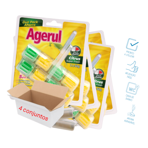 Este Bloco Sanitário é um produto da conceituada marca Agerul de aroma muito agradável para colocação na sua sanita. Possui uma fórmula anti-calcário e rende o dobro de outros produtos semelhantes. Escolha Poupança: Cada Bloco fica em apenas 1,24€