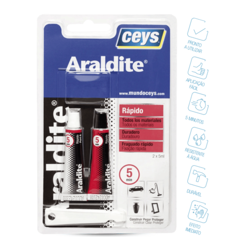 A Cola Araldite 5 Minutos é um adesivo epóxi de secagem rápida, ideal para colagens que exigem elevada resistência e precisão. Com uma fórmula especialmente desenvolvida para garantir uma aderência forte e duradoura, esta cola é indicada para uso em diversos materiais, como metal, madeira, cerâmica, cristal, vidro, borracha, plástico rígido e muito mais.