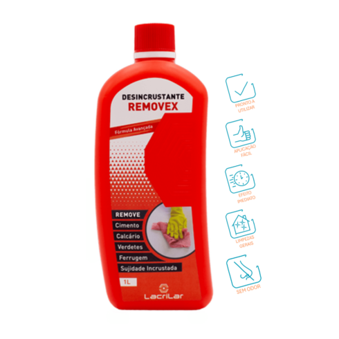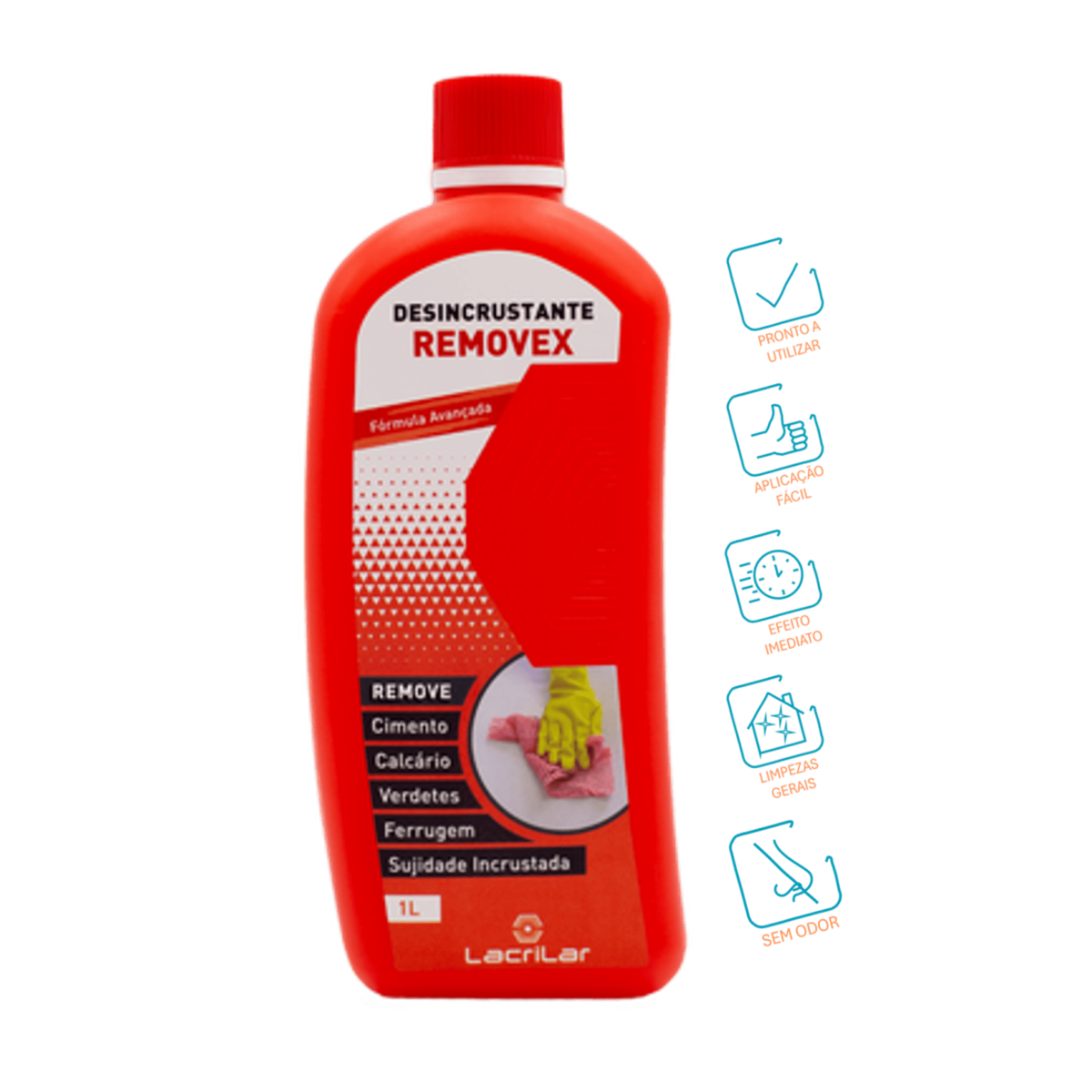 O Desincrustante Removex remove a sujidade incrustada de várias superfícies como cerâmica, mosaico, pedra, entre outros. É utilizado para limpeza pós-obra, paredes e pisos sujos.