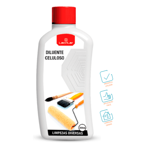 O Diluente Celuloso da marca Lacrilar é ideal para a limpeza de trinchas, rolos e pincéis. Este produto é reciclado e não deve ser utilizado como solvente de tintas e vernizes.