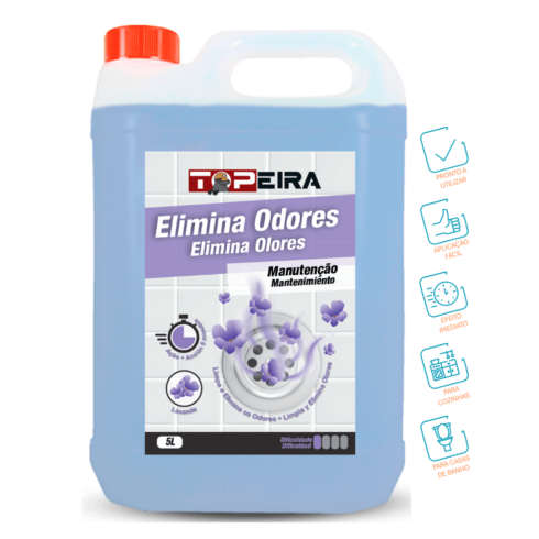 Remoção de Maus Odores: nas canalizações coloque cerca de 60ml de Topeira Elimina Odores diretamente na entrada do cano e aguarde 5 minutos. Após o tempo de espera verta água abundante. Periodicidade: Sempre que necessário.