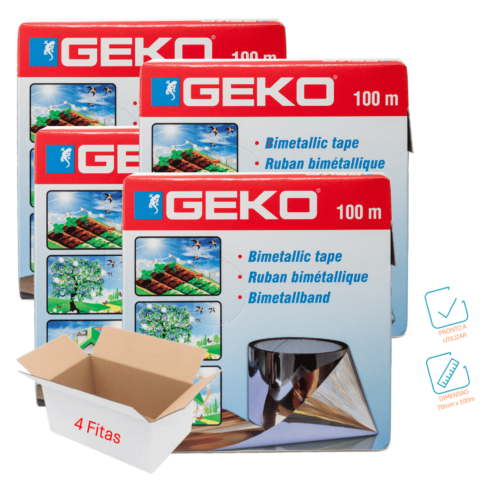 A Fita Espanta Pássaros com Duas Cores é bimetálica com uma face prateada e outra dourada, sendo que o reflexo do sol e o som do movimento mantém os pássaros longe.