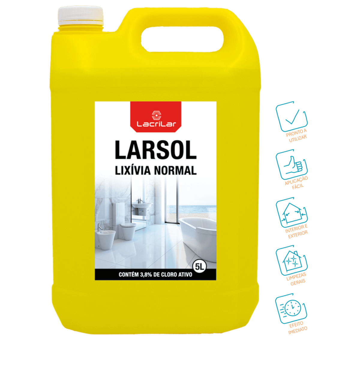 A Lixívia Larsol é ideal tanto para exteriores como para interiores. Este produto tem propriedades branqueadoras e desodorizantes.