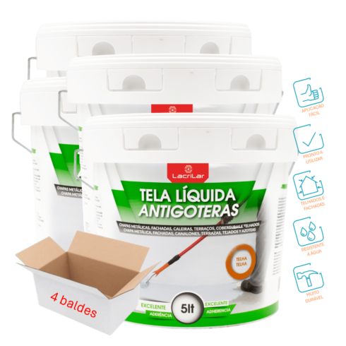 A Tela Líquida Lacrilar é ideal para telhados, coberturas, terraços, caleiras, chapas metálicas e fachadas; Tem características elásticas, sendo transitável em zonas de circulação reduzida. Escolha Poupança: Cada balde fica em apenas 24,92€ (ou 20,26€ sem IVA). Se pretender menos quantidade, clique aqui >>>