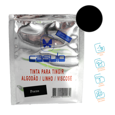 As tinta em pó da marca Casulo são indicadas para o tingimento de tecidos de algodão, linho e viscose. Cada saqueta de 12g é suficiente para tingir entre 250 a 300 gramas de tecido (pesado em seco). Possuímos em várias outras cores na nossa loja online.