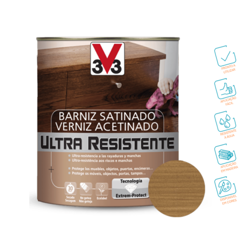 O Verniz Acetinado Ultra-Resistente Carvalho Escuro protege os móveis, objetos, portas, bancadas, entre outros. Proporciona uma alta proteção contra os riscos e as manchas.