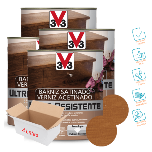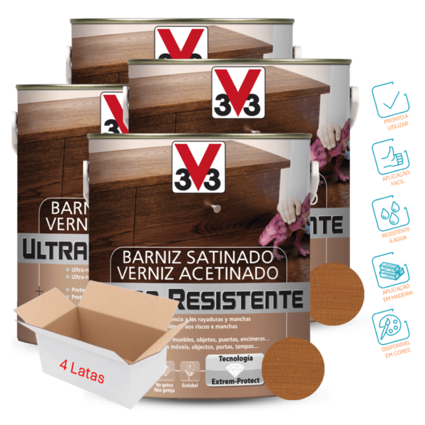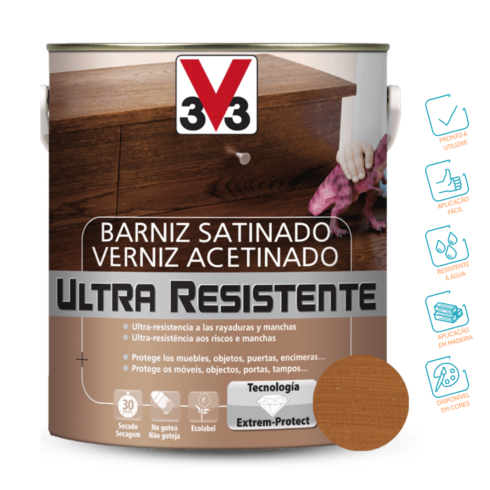 O Verniz Acetinado Ultra-Resistente Cerejeira protege os móveis, objetos, portas, bancadas, entre outros. Proporciona uma alta proteção contra os riscos e as manchas.