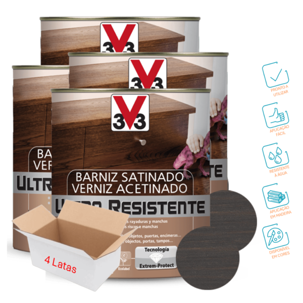 O Verniz Acetinado Ultra-Resistente Wenge protege os móveis, objetos, portas, bancadas, entre outros. Proporciona uma alta proteção contra os riscos e as manchas.